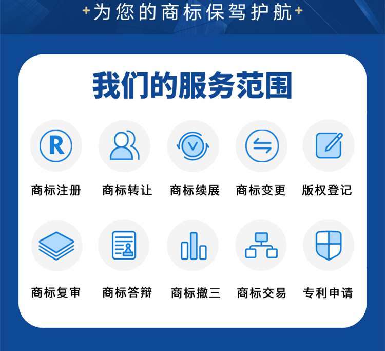 亿佰倍商标注册公司是国家知识产权局商标局备案、中国版权保护中心备案的一家专业知识产权代理服务机构,主要业务包括:知识产权代理(专利);为中外客户提供国内商标代理、国际商标代理、著作权代理及其他知识产权保护代理服务;代理商标评审、异议、答辩、转让、变更、撤销等案件;商标设计;商标交易;商标评估;知识产权方面的法律咨询、商标注册流程及费用哪家好信息法律事务服务等。